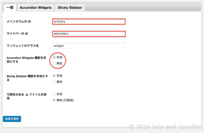 あと、下の赤丸「Accordion Widgets機能を有効にする」を「無効」に(初期設定では「有効」)。