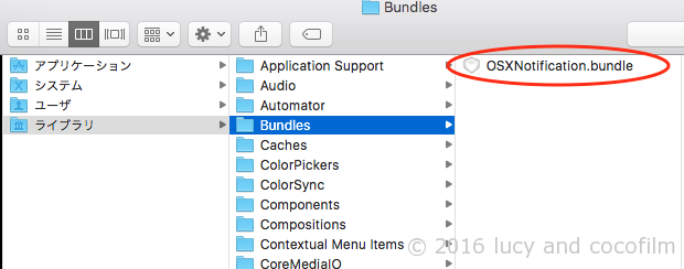 どうやらHDD直下の「ライブラリ」フォルダにある「Bundles」フォルダ内の「OSXNotification.bundle」というファイル(プラグイン?)を移動させるか捨てればよいと。